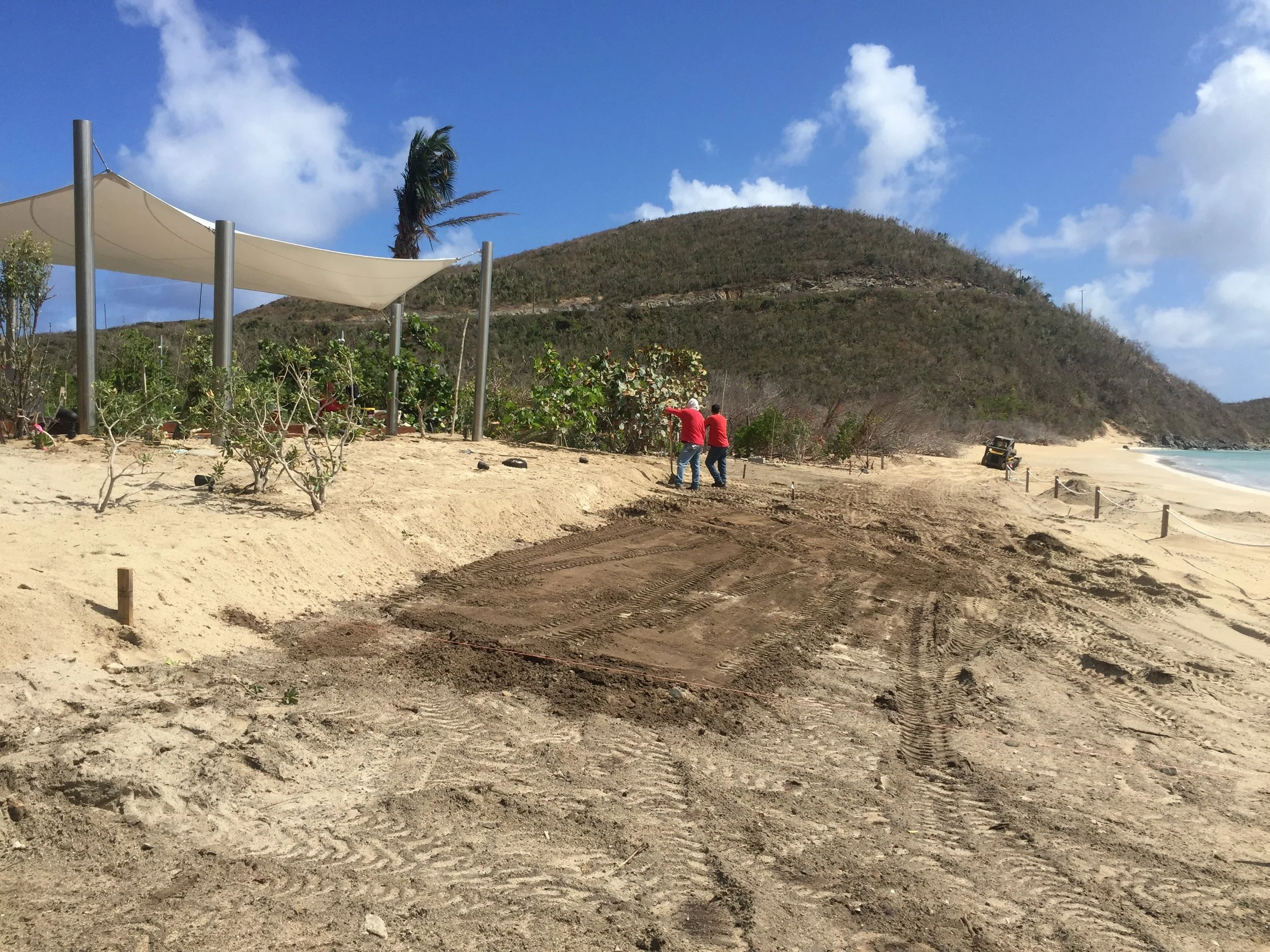 When Hurricane Irma struck, Virgin Gorda was left paralyzed—without public water or electricity for months. Management chose to dedicate the site’s private desalination system not to irrigation, but to the island’s people in need. Despite the loss of several large Lignum vitae trees and a few corozo palms, most vegetation across the property endured. The beach landscape, however, suffered the greatest damage, stripped not only of its plants but also of the organic matter that had slowly accumulated beneath the sand at their roots.
