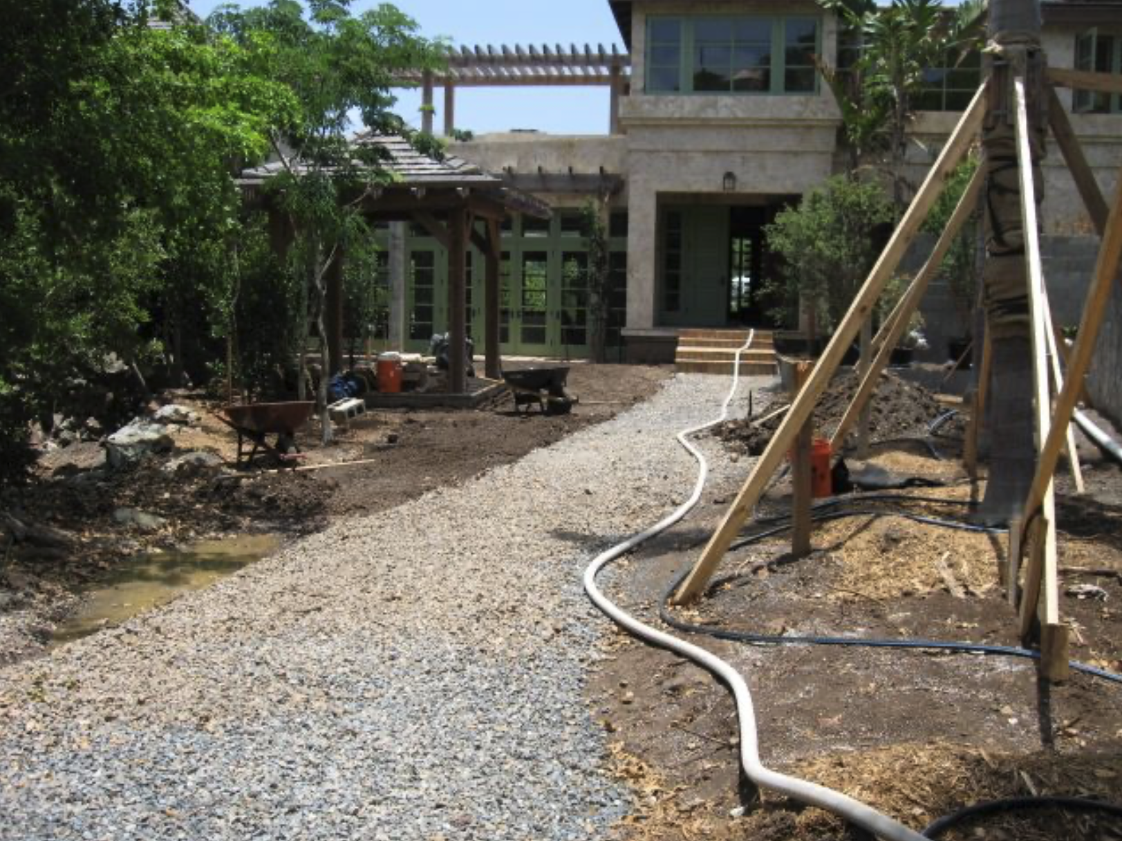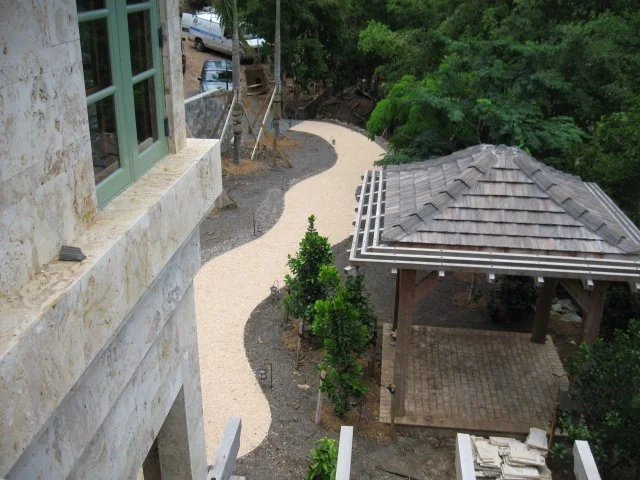 Over the gravel base, we installed a layer of finely crushed limestone to match the color and texture of the coral stone tiles cladding the house’s exterior walls.