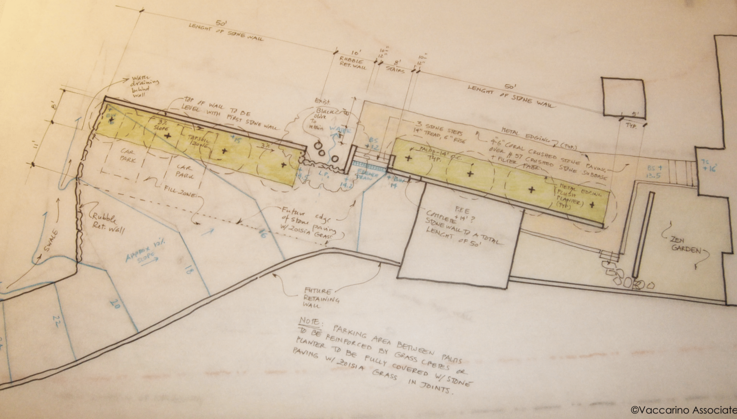 Phase One established core circulation and garden areas. Phase Two proposed capturing stormwater through bioretention swales flanking the driveway, directing flows toward the woodland around the Salt Pond community. Phase Three was to extend these strategies into the lower woodland.