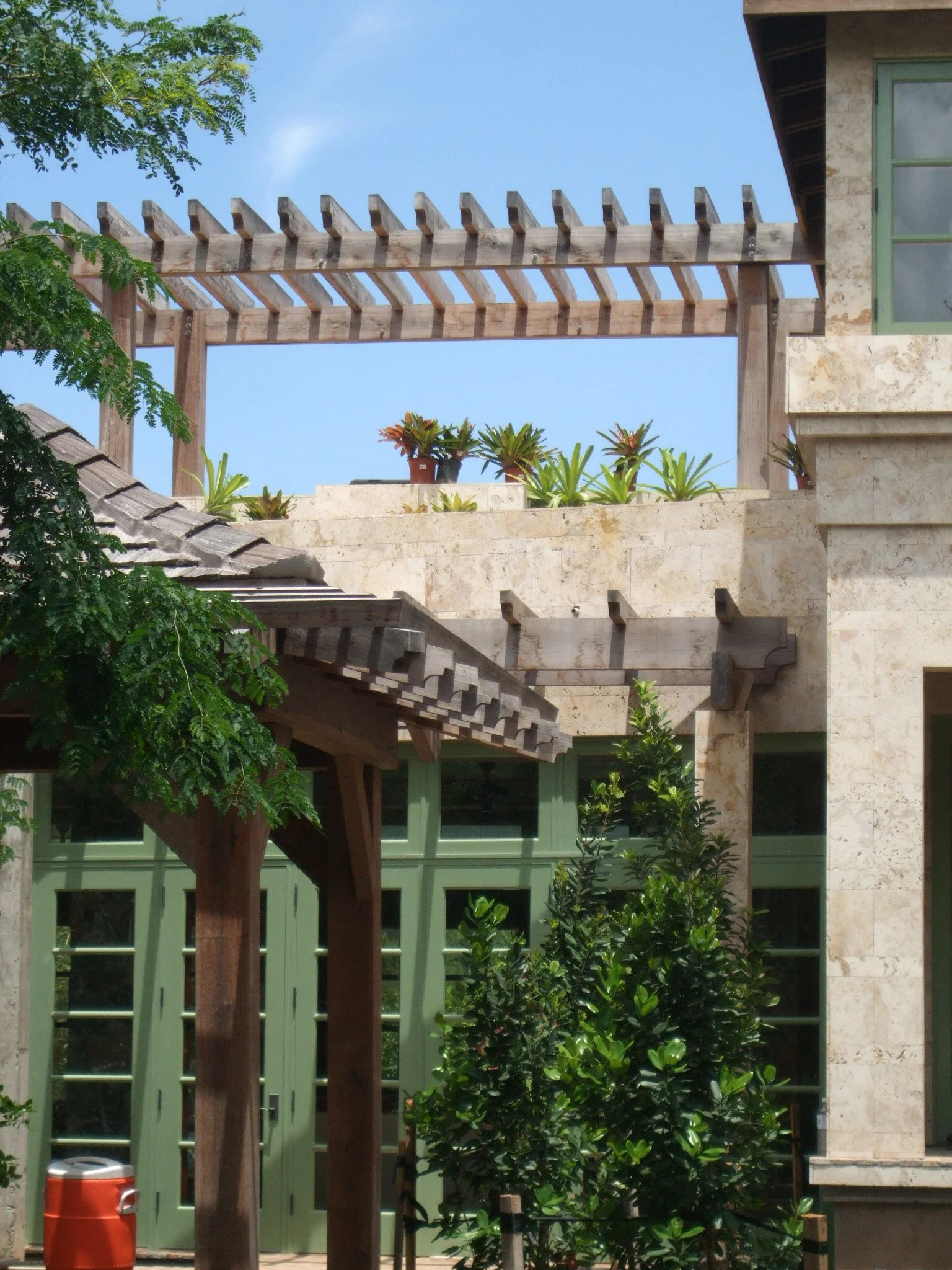 The pool was set on the second-floor terrace beneath a trellis with expansive ocean views. Tall coconut palms planted behind the seating area quickly screened hillside views, while on the ocean side the house now appears to cantilever above the restored coastal beach plant community.