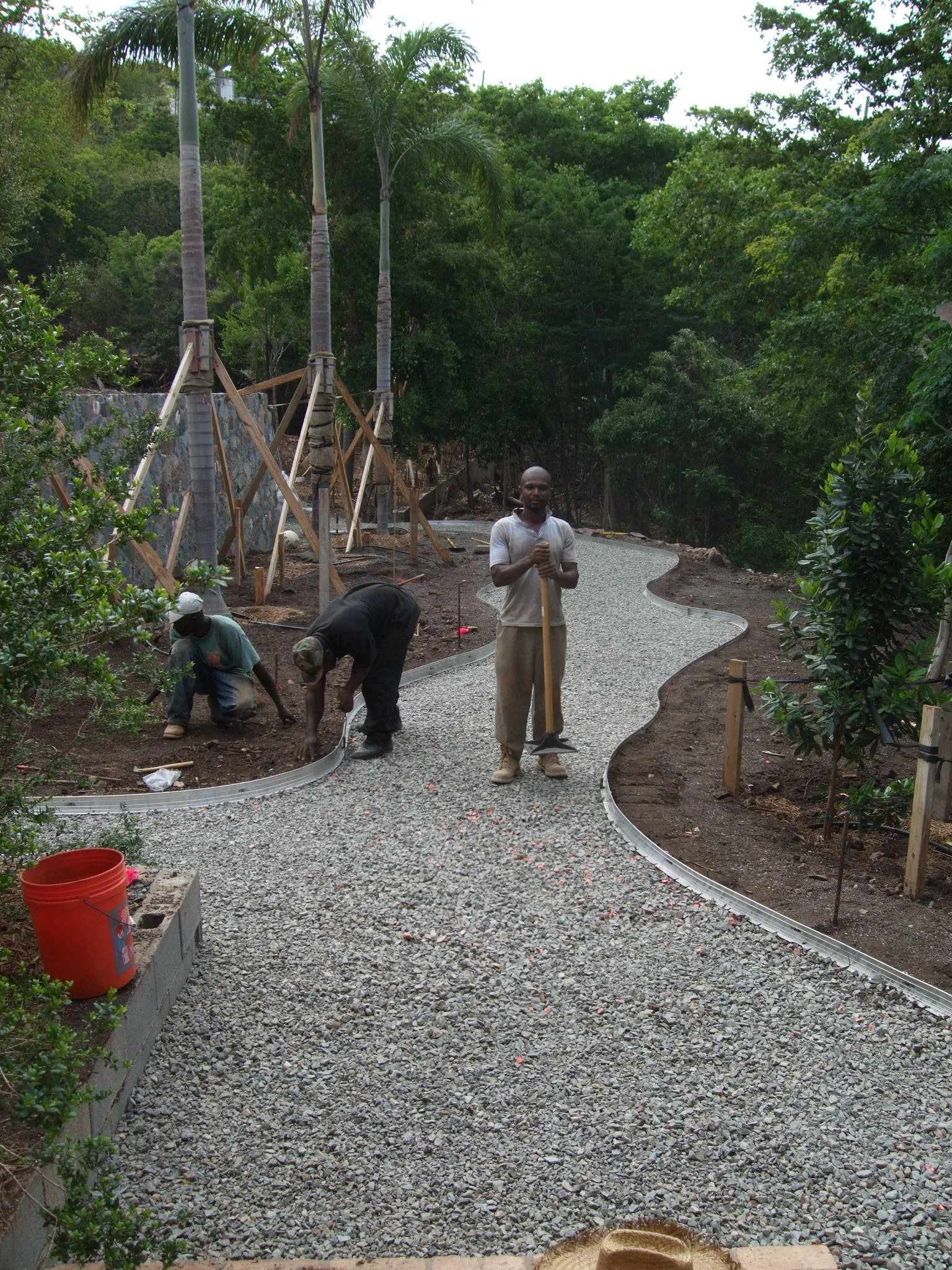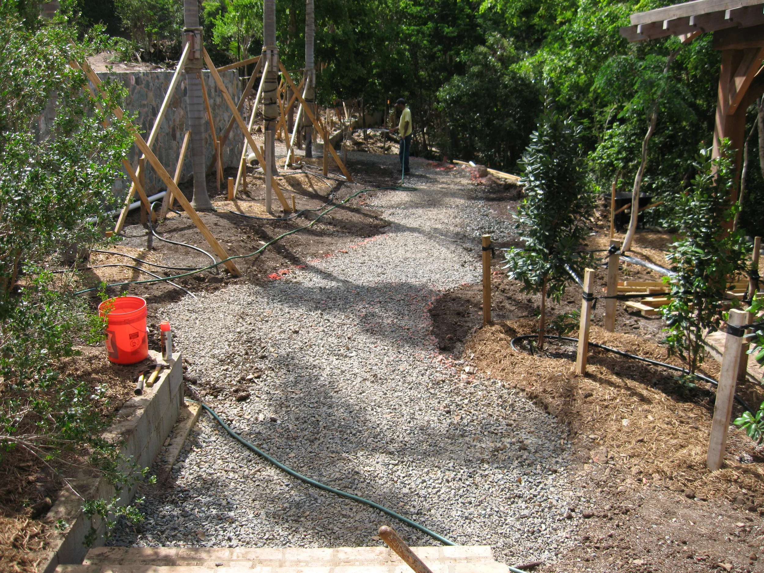 The original rectilinear approach was reconfigured on site into a curving, meandering path, built with a crushed gravel base and defined by aluminum edging.