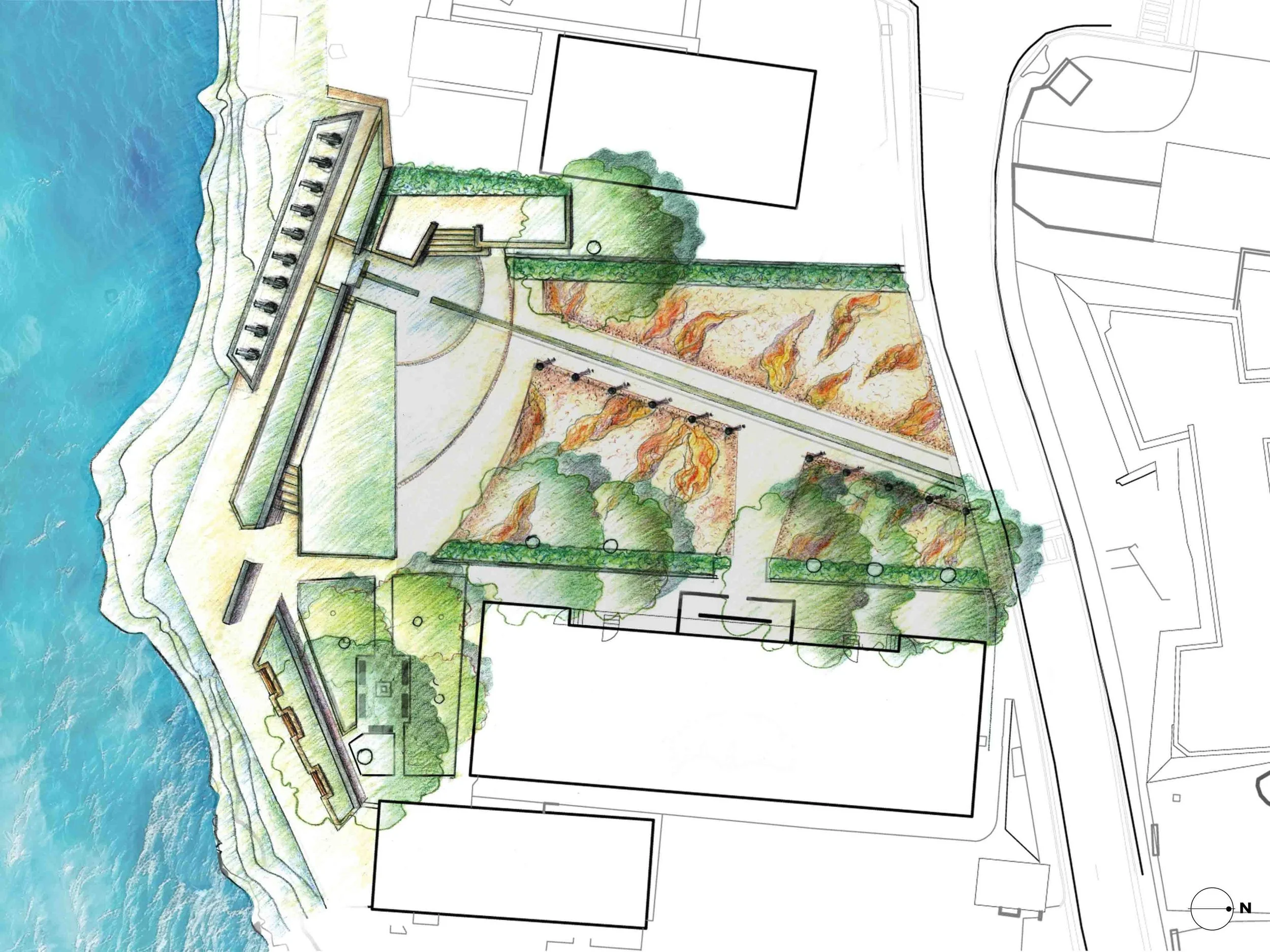 The site required a full upgrade of infrastructure, hardscape, lighting, and landscape to restore its dignity as a historic landmark. Storm-damaged mahogany trees with exposed roots disrupted paving, while air-conditioning chillers and mechanical equipment detracted from the main façade. Parking built on shoreline fill blocked views of the cannons, Transfer Monument, and ocean, while also harming marine life.
