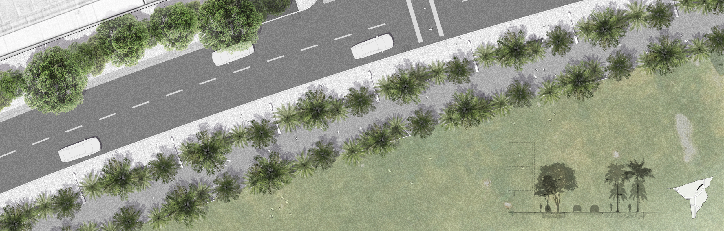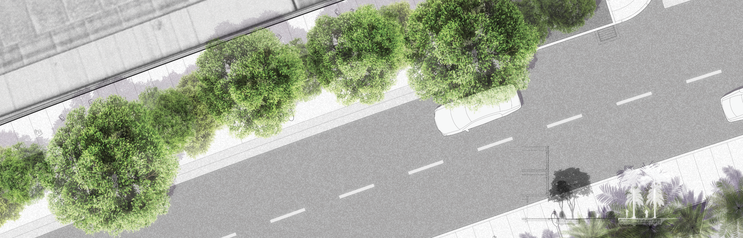 Laboratory Street functions as an urban ecotone—a transitional zone where contrasting programs and site conditions converge. Unlike the unified and symmetrical space of Saman Boulevard, its character is defined by asymmetry, with each edge taking precedence over the center. One side anticipates dense office development, the other a future park. This tension between built form and open space frames the identity of the street.